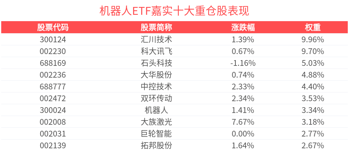 數(shù)據(jù)顯示,截至2025年6月30日,中證機(jī)器人指數(shù)前十大權(quán)重股分別為匯川技術(shù)、科大訊飛、石頭科技、大華股份、中控技術(shù)、雙環(huán)傳動(dòng)、機(jī)器人、大族激光、巨輪智能、拓邦股份,前十大權(quán)重股合計(jì)占比49.58%。