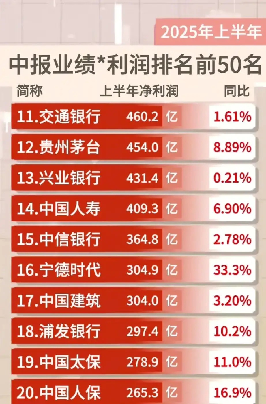 - 寧德時(shí)代(第16名)凈利潤(rùn)304.9億元,同比大漲33.3%,新能源賽道持續(xù)強(qiáng)勁。