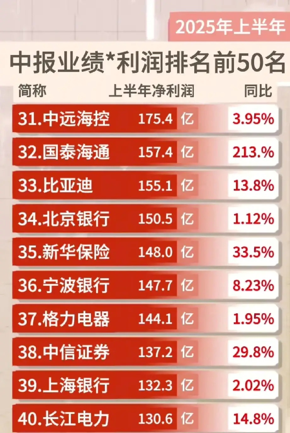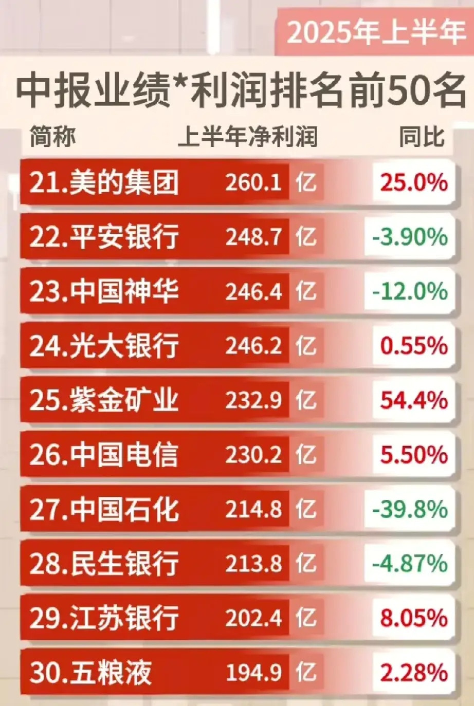整體而言,2025年上半年利潤(rùn)排名前50的企業(yè)中,既有傳統(tǒng)巨頭穩(wěn)定貢獻(xiàn)利潤(rùn),也有新興力量或特定行業(yè)公司表現(xiàn)搶眼,業(yè)績(jī)分化明顯,增長(zhǎng)與下滑并存。
