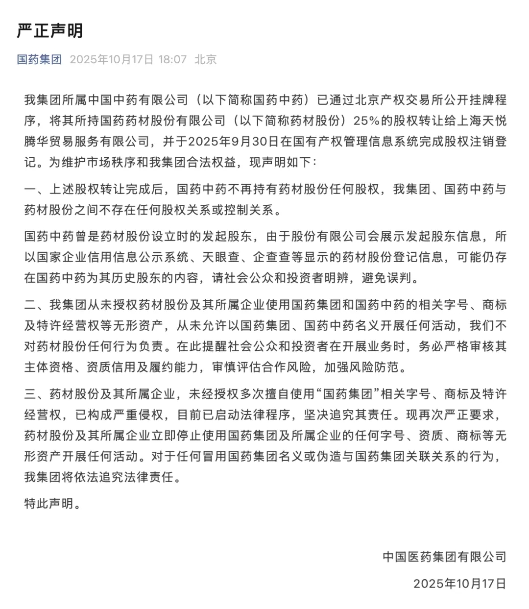 10月17日,中國醫藥集團有限公司(信富網簡稱國藥集團)發布聲明稱,集團所屬中國中藥有限公司(以下簡稱國藥中藥)已通過北京產權交易所公開掛牌程序信富網,將其所持國藥藥材股份有限公司(以下簡稱藥材股份)25%的股權轉讓給上海天悅騰華貿易服務有限公司,并于2025年9月30日在國有產權管理信息系統完成股權注銷登記。