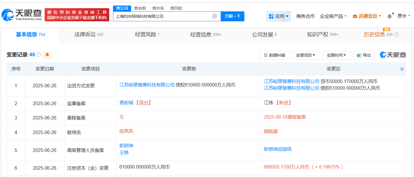 天眼查App顯示,近日,上海鈞豐網絡科技有限公司發生工商變更,注冊資本由61億元人民幣增至約66億元人民幣。該公司成立于2016年3月,法定代表人為彭照坤,經營范圍包括機械設備租賃、共享自行車服務、計算機系統服務等財盈策略,由江蘇哈啰普惠科技有限公司全資持股。